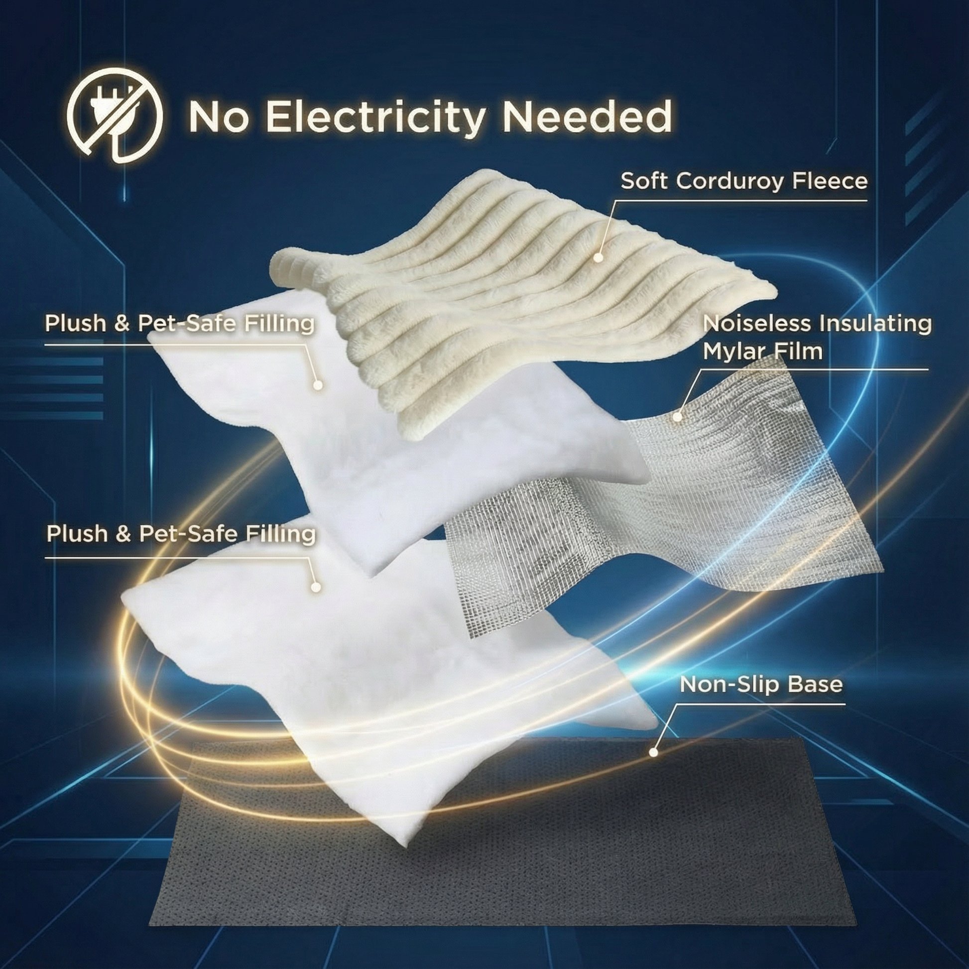 The soft corduroy fleece surface creates a cozy, calming space your pet will instantly love. Beneath it, a silent insulating mylar layer reflects warmth gently and quietly, without noise or discomfort. Inside, plush, pet-safe padding provides supportive cushioning, while the non-slip base keeps the mat securely in place on any surface.